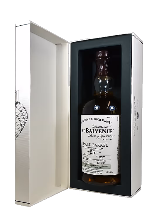 Balvenie 25 ani este un exemplu de whisky fin si elegant, un etalon intre cele mai rafinate bauturi. Aroma bogata si textura catifelata obtinute in distileriile din Speyside nu pot fi trecute cu vederea de cei mai excentrici amatori de single malturi fine. Pentru ca este o bautura matura, Balvenie de 25 ani este si una expresiva ce excita si delecteaza simturile. Culoarea obtinute in cei 25 de ani de maturare in butoaie din stejar este o simfonie pentru ochii cunoscatorilor. Nasul este captivat de aroma proaspata si placuta a fructelor de citrice, invaluita de parfumul elegant al piersicilor coapte. Mireasma ce completeaza acest tablou de vara aminteste de bucataria traditionala scotiana, intrucat aduce in prim plan aroma eleganta a untului sarat. Gustul este seducator si ofera rasfat intregii guri datorita merelor coapte, a pralinelor si a turtei dulci care nuanteaza acest whisky fin. Finish-ul este pe masura, proaspat si elegant si captivant.
