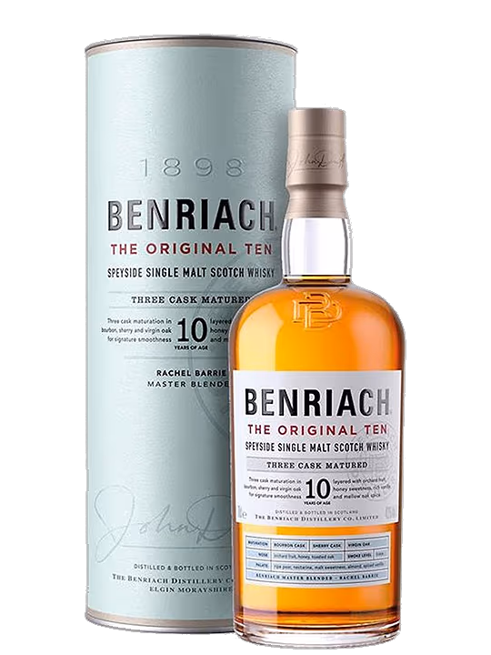 Original 10 incapsuleaza caracterul neted si multistratificat al lui Benriach. Acest whisky a fost maturat timp de cel putin zece ani in butoaie de bourbon, butoaie de sherry si stejar virgin, pentru a crea straturi de fructe de livada delicioase, malt somptuos cu miere si stejar prajit, toate impletite cu o urma subtila de fum.