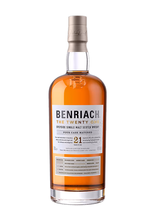 Un remarcabil single malt din Speyside, produs la distileria Benriach, a fost creat printr-o combinatie intre spirt neturbat si spirt turbat si a fost maturat cu grija timp de 21 de ani in patru tipuri diferite de butoaie: bourbon, sherry, stejar virgin si vin rosu Bordeaux.