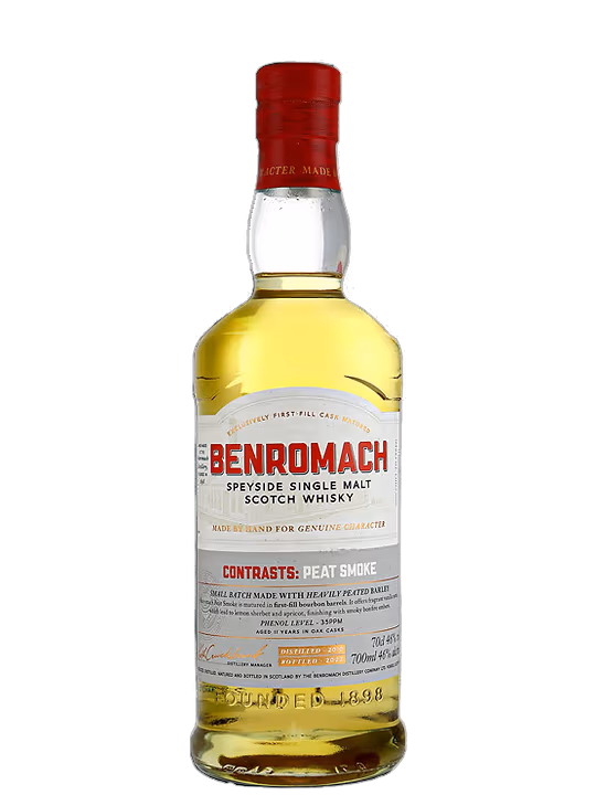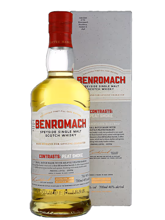 Benromach Peat Smoke 2010 Bottled 2022 este un whisky single malt scotian distinctiv, produs de distileria Benromach din regiunea Speyside. Acest whisky este cunoscut pentru utilizarea maltului foarte turbarit, oferindu-i o caracteristica de fum pronuntata si un profil aromatic intens. Benromach Peat Smoke se potriveste de minune cu preparate pe baza de carne afumata, branzeturi maturate, deserturi cu ciocolata neagra sau chiar preparate mediteraneene cu arome indraznete.