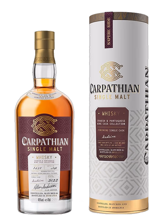 Acest sortiment de whisky Carpathian este distilat de doua ori si maturat initial in butoaie de stejar alb american, ex-Kentucky Bourbon.
