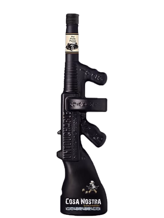 Sticla de Scotch Whisky Cosa Nostra este o replica autentica a celebrului pistol mitraliera Tommy Gun din epoca prohibitiei, sugerand asocierea cu influenta si forta Mafiei Siciliene.