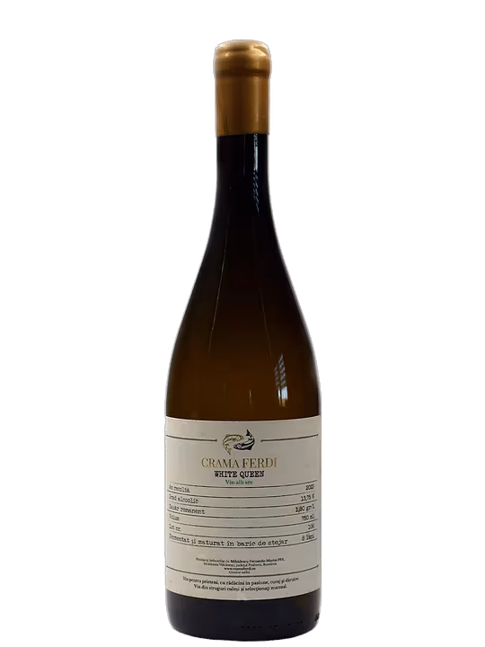 White Queen de la Cramele Ferdi este un tribut adus rafinamentului, un Chardonnay de o eleganță impunătoare. Fermentat și maturat în barrique de stejar francez, își dezvăluie identitatea printr-un buchet bogat de caise coapte și piersici zemoase, ce evocă razele blânde ale soarelui într-o livadă de vară. Aromele sale alunecă grațios, purtând o poveste de măiestrie și atenție la detalii, o promisiune de armonie ce inspiră încredere.