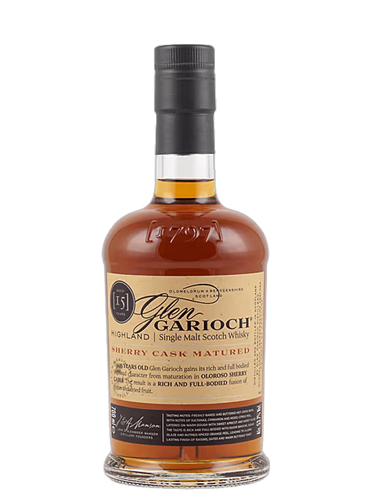 Glen Garioch 15 Years Sherry Cask Matured este un whisky single malt scotian rafinat, provenit din distileria Glen Garioch, situata in regiunea Highland. Acest whisky este cunoscut pentru maturarea sa exclusiva in butoaie de sherry, care ii confera profunzime si complexitate, specifica whisky-urilor de inalta calitate. Acest whisky a primit multiple premii si distinctii in competitii internationale de whisky, fiind apreciat de experti pentru calitatea si complexitatea sa.