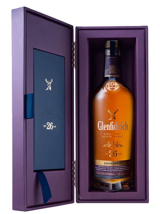 In paharele de Glenfiddich 26 ani se destainuie buchete aromatice complexe, dominate de flori de livada, violete si iarba proaspata. Gustul, care impresioneaza de la prima inghititura, este vibrant dominat de arome dulci de zahar brun vanilat si condimente asortate. Notele puternice ale lemnului de stejar se fac remarcate incet, dupa ce savoare dulce se elibereaza. Finish-ul lung este apreciat de pasionatii de bauturi fine.