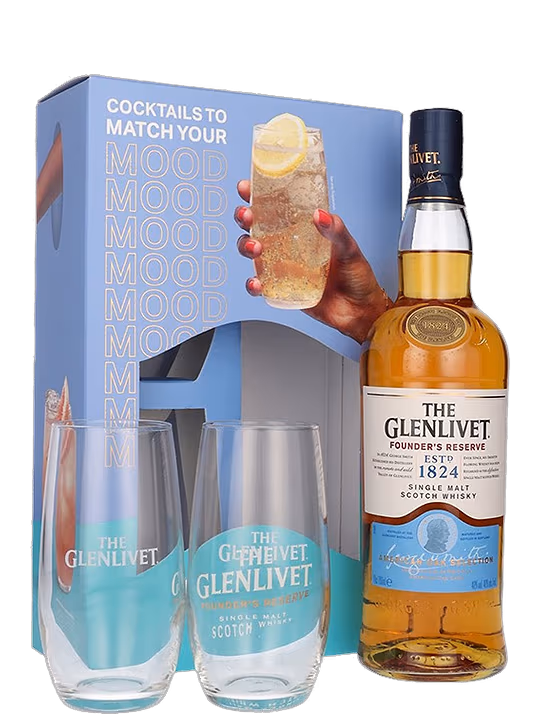 Glenlivet Founder's Reserve cu 2 pahare poate fi considerat un cadou special pentru ocazii deosebite. Whisky-ul este unul simplu, elegant cu buchet aromatic proaspat, fapt ce il face usor de apreciat atat de cunoscatori cat si de persoanele mai putin familiarizate cu intensitatea acestei bauturi.