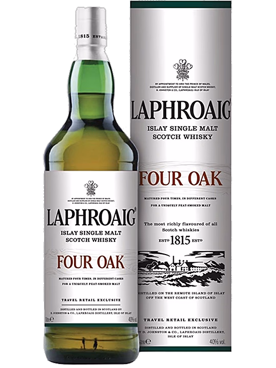 Laphroaig Four Oak este un whisky single malt maturat intr-un cvartet de butoaie, incluzand ex-bourbon, stejar american, stejar european si butoaie locale.