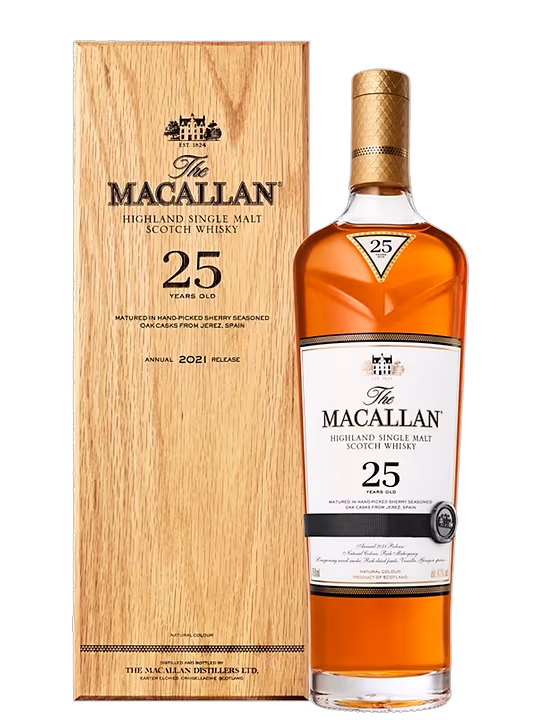 Macallan Sherry Oak, invechit timp de 25 de ani, este o pretioasa aditie in gama Sherry Oak, care cuprinde o selectie de whisky-uri single malt maturate exclusiv in butoaie de stejar, imbibate anterior cu sherry Oloroso de la Jerez, selectat manual pentru a adauga bogatie si complexitate.