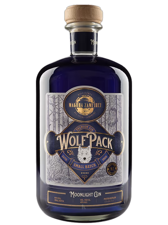 Wolf Pack Moonlight Gin este o bautura distilata din 15 plante atent selectionate. In reteta creata cu mare grija se regasesc note de coacaze negre, vanilie, scortisoara, piper rosu, ghimbir, iris florentin si grauntele paradisului. Culoarea spectaculoasa de albastru ultramarin se obtine prin infuzarea cu flori de Clitoria Ternatea, fara absolut nici un pic de colorant artificial. Incanta vizual si cu un mic “spectacol de magie” atunci cand este mixat intr-un gin tonic, el trece magic de la culoarea albastru ultramarin la un spectaculos violet deschis.