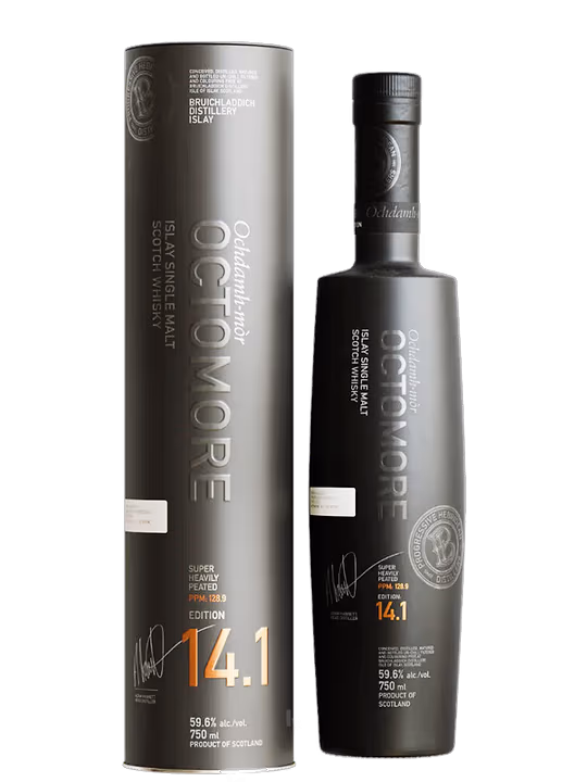 Octomore 14.1 se remarcă printr-un profil aromatic intens și complex, cu un început dominat de vanilie afumată și caramel, peste care se aștern accente de fum de turbă și citrice coapte. Alături de aceste arome apar și note neobișnuite, precum prăjitură cu bezea de lămâie și carne friptă, conturând o experiență olfactivă inedită și surprinzătoare.