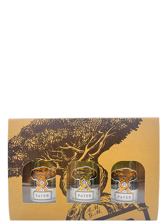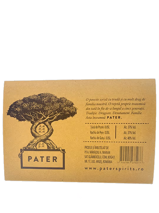 Cutia PATER cu 3 miniaturi ofera o selectie variata de palinca, inclusiv tuica de prune, rachiu de pere si rachiu de gutui.
