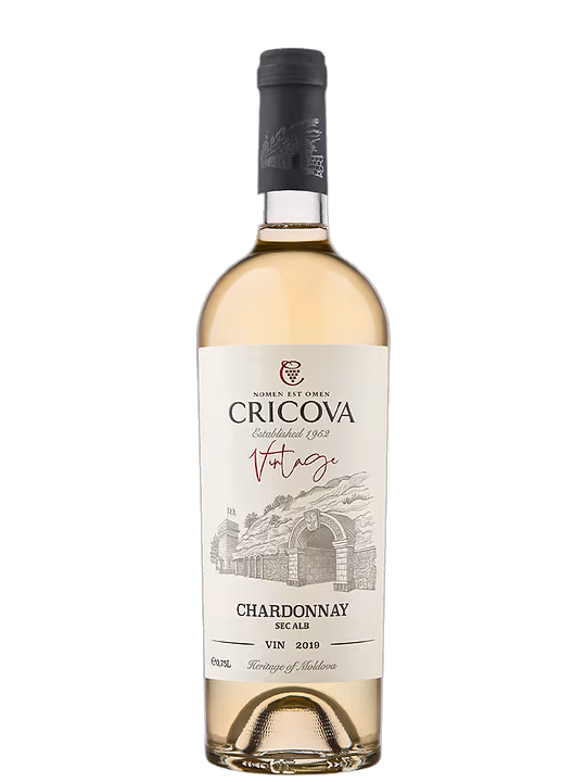 Cricova Vintage Chardonnay este un vin alb sec produs de Cricova, una dintre cele mai cunoscute si respectate crame din Republica Moldova. Este realizat din struguri 100% Chardonnay, recoltati manual si prelucrati cu atentie inainte de a fi lasati sa fermenteze in butoaie de stejar.